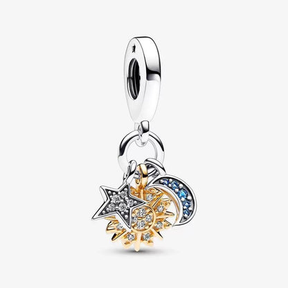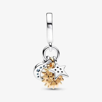 Aggiungi tre simboli celesti al tuo look con questo charm Pendente Stella, Sole e Luna. Il charm combina un motivo ispirato al sole, realizzato nell’esclusiva lega metallica placcata oro 14k e decorato pietre scintillanti e micro-sfere, una stella in Argento Sterling 925 con pavé luminoso, e una luna crescente in Argento Sterling 925 con pietre blu intenso. Indossalo come simbolo di equilibrio e armonia.