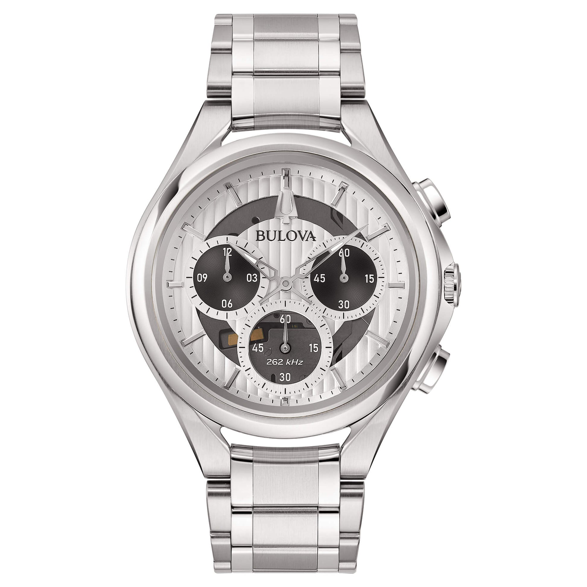Montre habillée Curv, chronographe de luxe, mouvement Curv, verre saphir, montre en acier, design élégant, fond de boîtier transparent, montre étanche, accessoire de luxe, Bulova Curv.