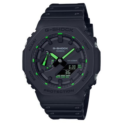 La montre Casio G-SHOCK GA-2100-1A3 se distingue par son design élégant et robuste. Son boîtier octogonal en résine noir mat et ses détails fluo rendent ce modèle unique et accrocheur. Les aiguilles des heures et des minutes sont dotées d'une peinture phosphorescente pour une visibilité optimale même dans l'obscurité, idéale en toutes circonstances .