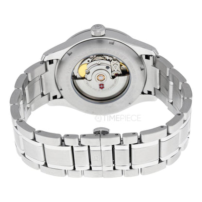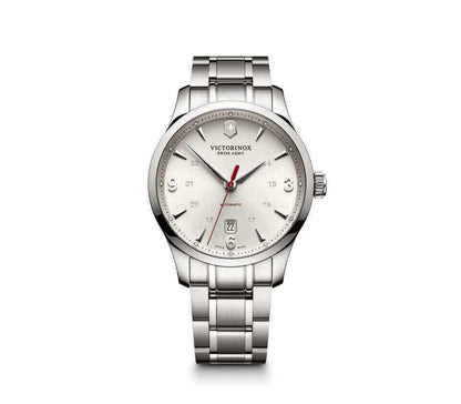 Collection Alliance de Victorinox, simple et raffinée. Mouvement mécanique à remontage manuel avec affichage de la date à 6h. Bracelet en acier pour cette montre homme au design épuré.