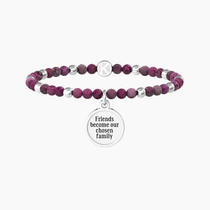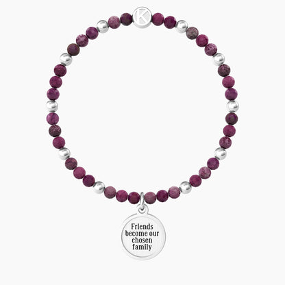 Bracciale elastico in acciaio con agata striata fucsia e ciondolo lucido e satinato con frase "Friends become our chosen family".