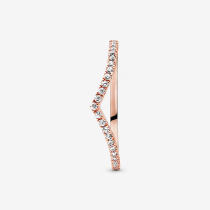 Presentiamo il Delicato Anello Desiderio Scintillante, un gioiello che realizza tutti i tuoi desideri. Questo anello raffinato è adornato da pietre di zirconia cubica, sapientemente incastonate su una delicata fascia placcata in oro rosa 14k. La sua semplicità è allo stesso tempo elegante, rendendolo un oggetto luminoso e prezioso. Puoi indossare questo anello chevron da solo, facendolo brillare come elemento centrale del tuo look, oppure puoi abbinarlo ad altri anelli Pandora per creare uno stile unico e autenticamente personale.