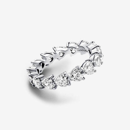 Ogni pietra è incastonata con grazia e precisione, sostenuta da due griffe rotonde e una terza a forma di V sulla punta, garantendo una tenuta sicura e una presentazione elegante. Questo anello è un simbolo perfetto di un amore senza fine e di dedizione profonda.