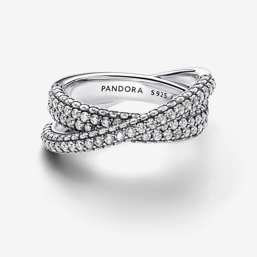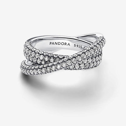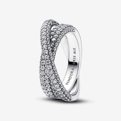 "Luminoso e senza tempo, l'Anello Pavè Fascia Intrecciata è un capolavoro di gioielleria realizzato in Argento Sterling 925. Questo anello è composto da due fasce di pavé sovrapposte, ognuna con un design unico. La fascia inferiore è più ampia, con due file di brillanti pietre di pavé al centro, mentre la fascia sovrapposta è più stretta e presenta una fila centrale di pavé. Entrambe le fasce sono poi ornate da file di pietre leggermente più piccole sui lati, creando un profilo quadrato leggermente arrotondato che scintilla da ogni angolazione. Questo anello può essere indossato con grazia da solo per un tocco di eleganza, oppure può essere abbinato ad altri gioielli decorati con pavé della collezione Timeless per creare un effetto luminoso che cattura l'attenzione."