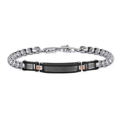 Bracciale da uomo in acciaio 316L con pvd nero e rosé cm 21, chiusura regolabile, piastra nera e maglia del bracciale a catena ad anelli rotondi