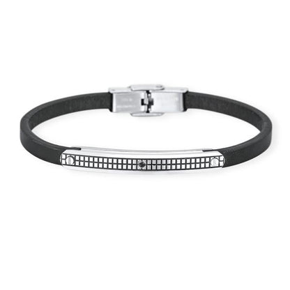 BRACCIALE DA UOMO IN ACCIAIO 316L PELLE CON PIASTRINA IN ACCIAIO E CRISTALLO NERO AL CENTRO CM 21