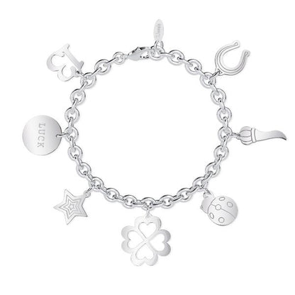 BRACCIALE DA DONNA IN ACCIAIO 316L CON CIONDOLI, CORNETTO, 13, COCCINELLA, QUADRIFOGLIO, CUORE, FERRO DI CAVALLO,STELLA. CHIUSURA REGOLABILE