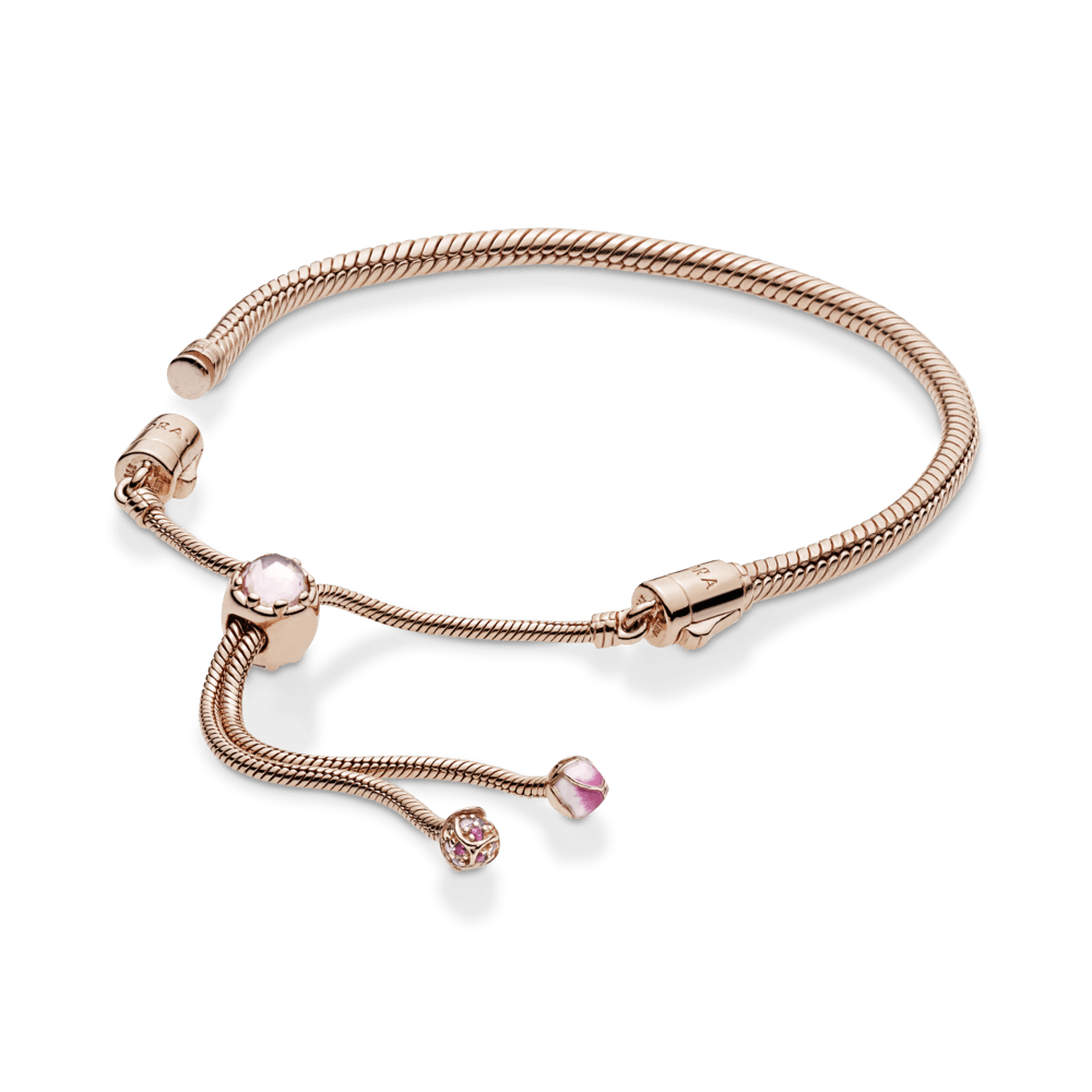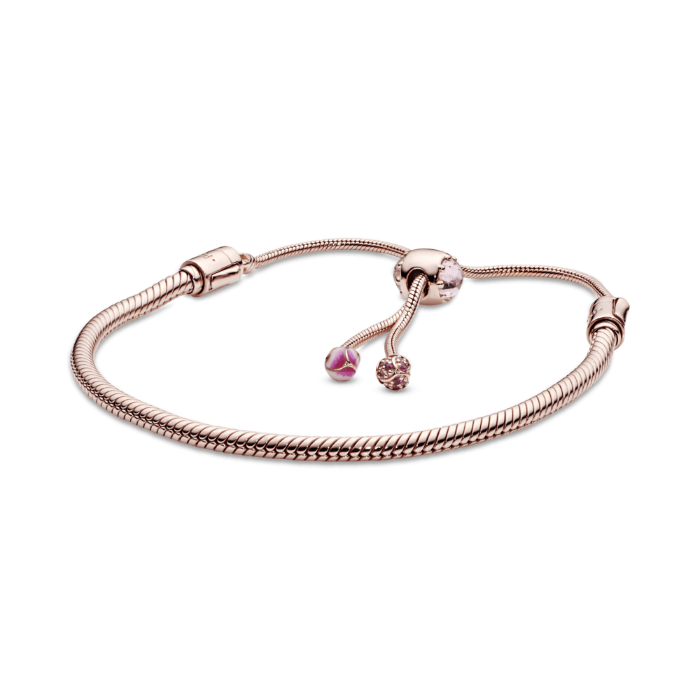 Preparati a mostrare la tua nuova collezione di charm con il bracciale componibile dalle sfumature rosate, realizzato in Pandora Rose, la nostra esclusiva lega metallica con placcatura in Oro rosa 14K. Le estremità del bracciale sono decorate con boccioli di fiori di pesco e la chiusura regolabile permette di adattarlo ad ogni polso. Indossa il bracciale con i tuoi charm preferiti della collezione Pandora Moments per raccontare la tua storia o le cose che ami. Il bracciale ha una misura 2, equivalente a 28 cm regolabile.