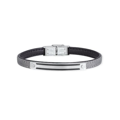 Bracciale da uomo con piastra in acciaio 316L pvd nero, pelle nera, nylon grigio cm 21