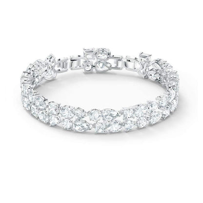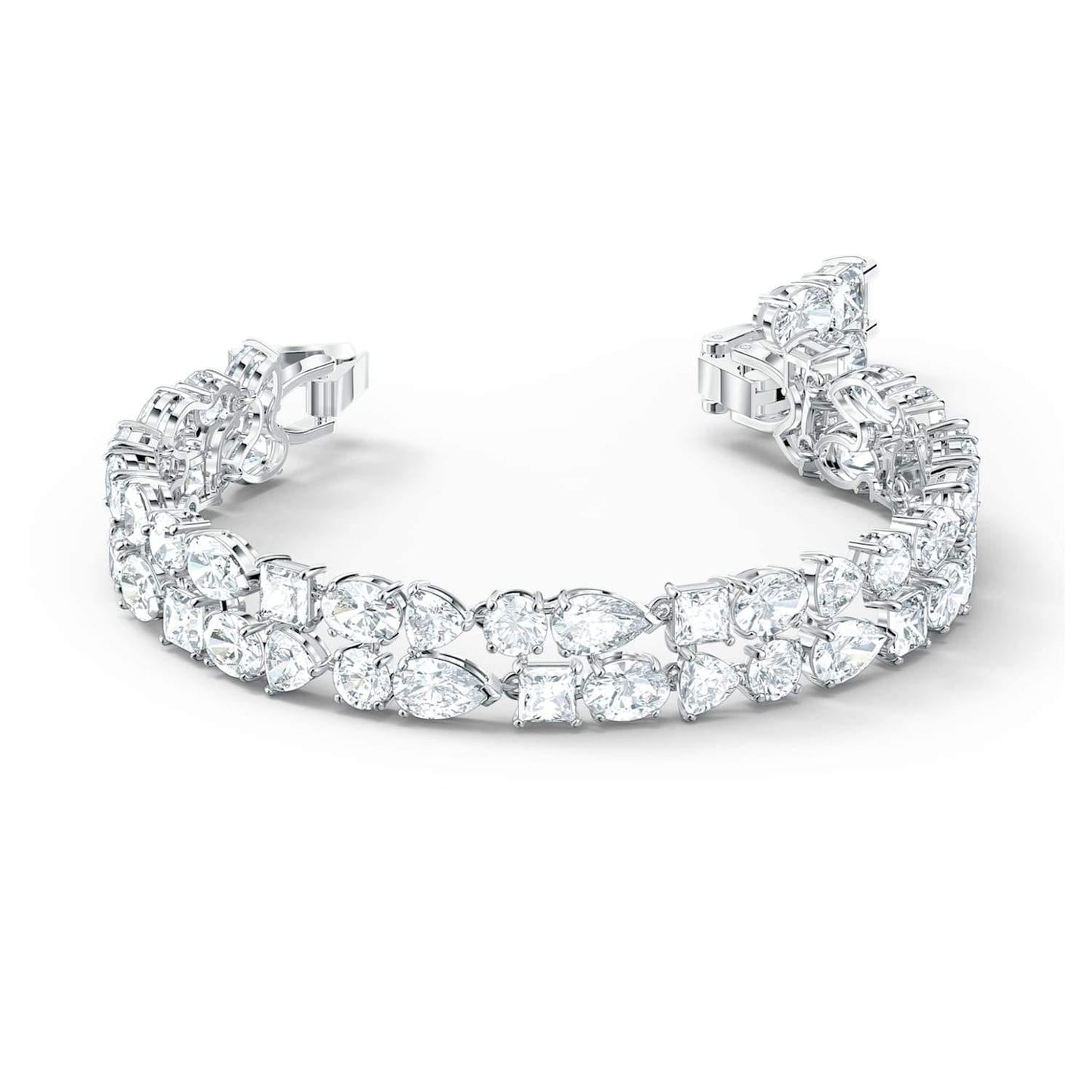 Questo elegantissimo bracciale Swarovski sfoggia un’intramontabile bellezza. Due file di pietre bianche sfaccettate brillano luminose, alternando forme quadrate, a goccia e rotonde, con tagli ovali e Trillian raffinati, per un effetto assolutamente abbagliante. Con la chiusura a moschettone ripiegato, il bracciale si presta magnificamente agli abbinamenti con altri gioielli in coordinato, ideale per impreziosire ogni tuo look. Una splendida idea regalo.