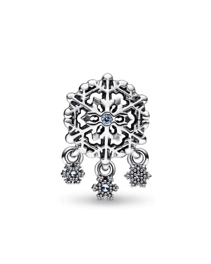 Questo charm a goccia Fiocco di Neve Ghiacciato rifinito a mano, celebra la bellezza e l'unicità della natura. Il charm presenta un intricato fiocco di neve intagliato in Argento Sterling 925, decorato da un cristallo azzurro creato dall'uomo su ogni faccia e da intagli a forma di fiocco di neve intorno ai lati del charm. Tre fiocchi di neve più piccoli pendono dal charm, donando un senso di movimento che ricorda i fiocchi di neve che danzano nell'aria ghiacciata. Ogni pendente è leggermente diverso e contiene un cristallo creato dall'uomo. Indossalo con un look ispirato all'inverno per ricordare sempre di celebrare ciò che rende ognuno di noi unico.