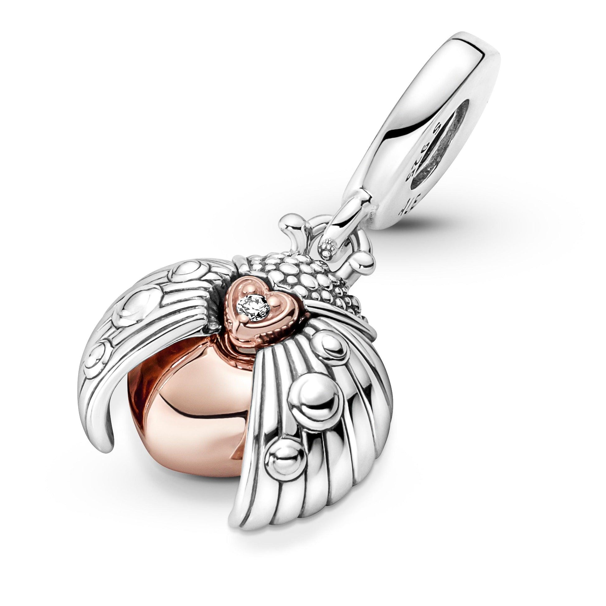 Prendi il volo con il charm Pandora Club di quest'anno, il pendente Cuore e coccinella Pandora Club 2022, simbolo universale di fortuna e speranza. Le ali del charm, realizzate in argento sterling 925, si aprono per rivelare una sorpresa speciale all'interno: un cuore lucente placcato in oro rosa 14k e decorato da un diamante rotondo creato in laboratorio dal taglio brillante. Sul retro del cuore, il charm reca l'incisione "Hope has wings" (La speranza ha le ali), un simbolo per le tue speranze per il nuovo anno e oltre. Indossa questo gioiello per simboleggiare la tua forza interiore e le tue aspirazioni.
