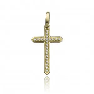 Croce in oro giallo 18K, impreziosita da diamanti bianchi taglio brillante per un tocco di luminosità e eleganza. Un simbolo sacro raffinato, ideale per chi cerca un gioiello dal significato spirituale e dallo stile senza tempo.
