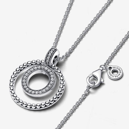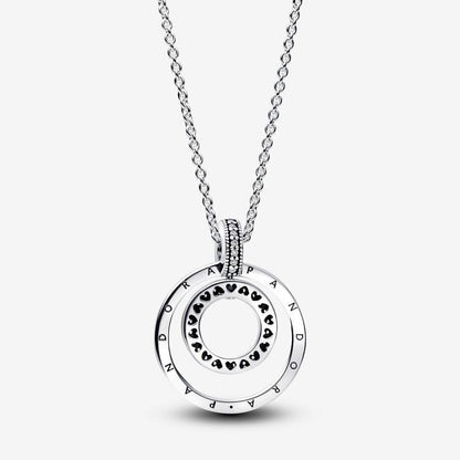 Collana della collezione Pandora Signature da donna. Colore: argento. Collana in Argento Sterling 925 con pendente, sfere e pavé con logo Pandora che presenta due cerchi texturizzati, uno dei quali ruota e aggiunge un tocco dinamico. I cuori intagliati ornano il retro del pendente, mentre una fila di pavé scintilla sul gancio. Due anelli di congiunzione consentono di regolarne la lunghezza, rendendolo il gioiello perfetto per ogni occasione. Lunghezza: 50 cm.