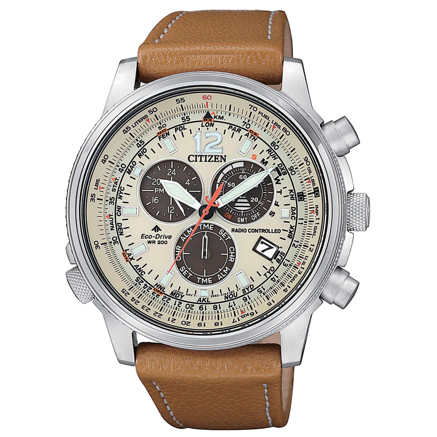 Cassa in acciaio, cinturino in pelle. Vetro zaffiro. Ghiera girevole bidirezionale (tramite corona a ore 8) con sistema regolo calcolatore. WR 20 bar.