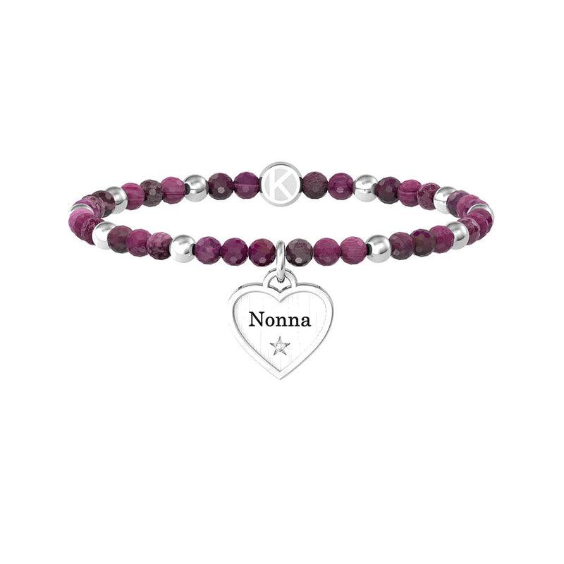 - Bracciale elastico Nonna in acciaio con agata striata fucsia e ciondolo satinato a forma di cuore con cristallo bianco e scritta "Ti voglio bene".