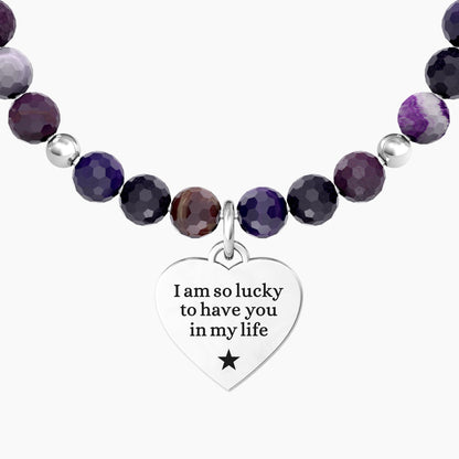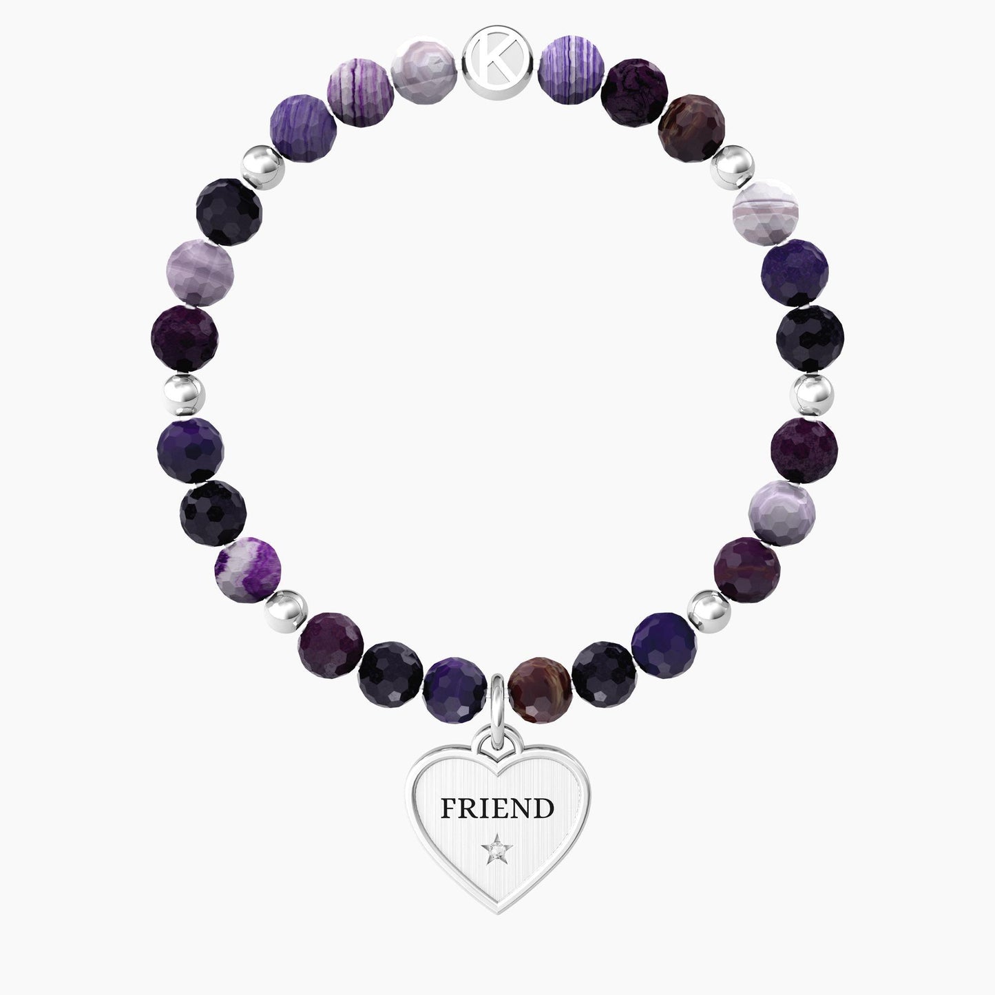 Bracciale elastico Amica in acciaio con agata striata viola e ciondolo satinato e lucido a forma di cuore con cristallo bianco e scritta "Friend I am so lucky to have you in my life".