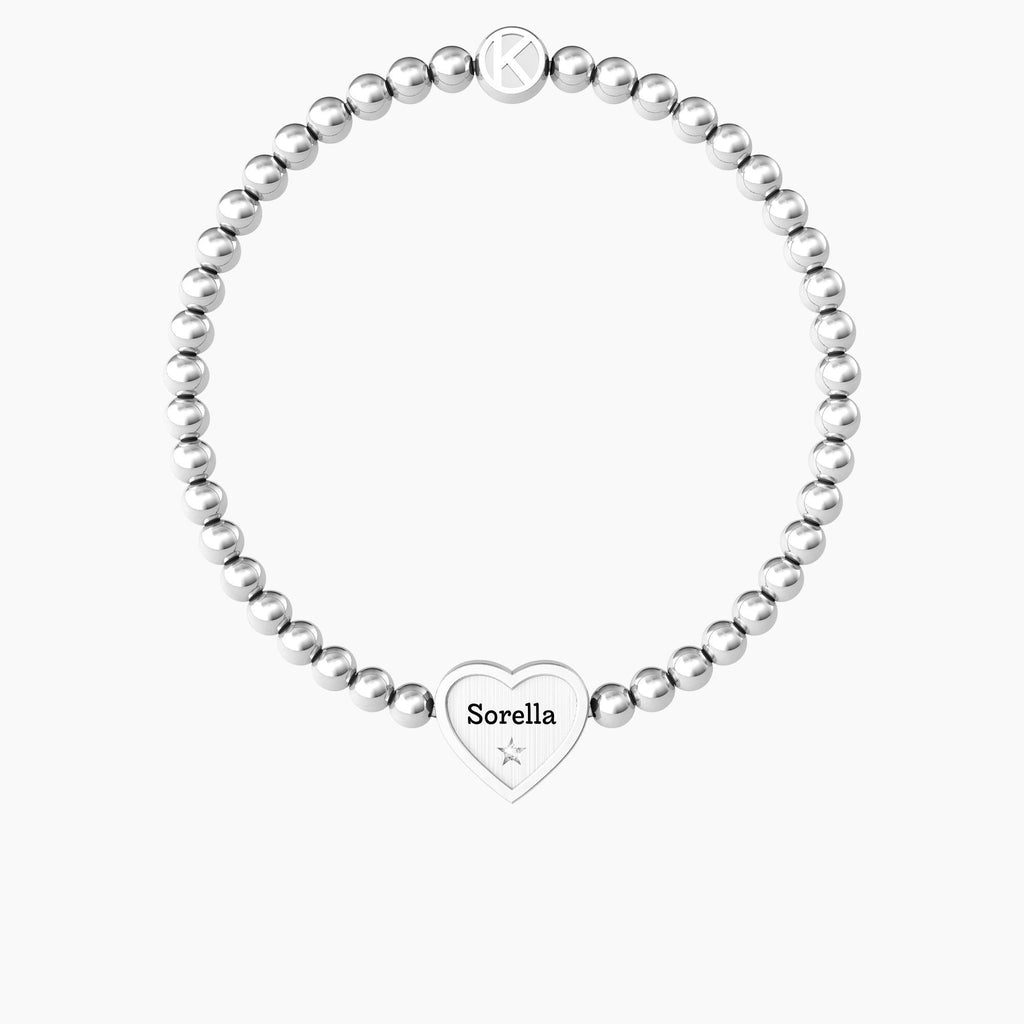 Bracciale elastico in acciaio con sfere lucide e ciondolo satinato taglio cuore con cristallo bianco e scritta "Sorella".