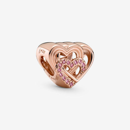 Addolcisci il tuo stile con il charm Cuori d'amore intrecciati. Rifinito a mano e realizzato in metallo con placcatura in oro rosa 14k, il charm è caratterizzato da tre cuori aperti intrecciati. Un cuore grande presenta una superficie lucida, l'altro sfoggia linee incise e il terzo è decorato da pietre di zirconia cubica rosa che danno al gioiello un tocco di brillantezza e femminilità. I lati del charm recano incise le parole "Love Forever" e "& Always", simboleggianti l'eternità e la forza dell'amore. Aggiungi questo gioiello alla tua collezione per portare con te il ricordo delle persone a cui vuoi bene, o regalalo a una persona speciale per celebrare il vostro legame unico e speciale. Il design dettagliato e le sfumature calde dell'oro rosa lo rendono un gioiello versatile e facile da abbinare a qualsiasi outfit, per un look romantico e sofisticato. La placcatura in oro rosa 14k garantisce la massima durata e la lucentezza del vero oro rosa