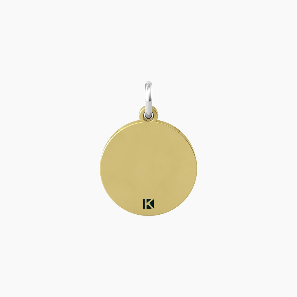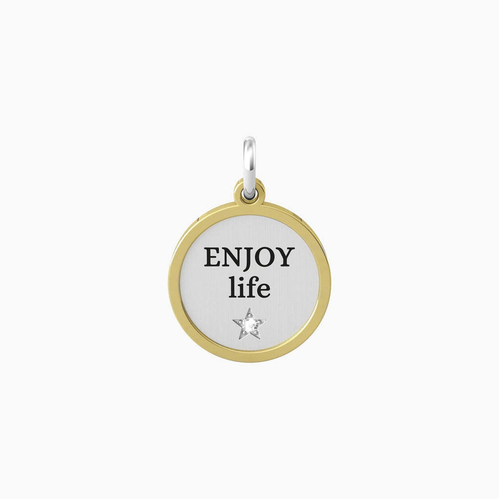 Ciondolo in acciaio satinato e lucido con bordo in PVD giallo, cristallo bianco e scritta "Enjoy life".