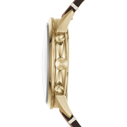 Orologio Cronografo Da Uomo Di Fossil Della Collezione Townsman. Orologio Con Cassa Della Dimensione Di 44 Mm, Realizzata In Acciaio Inossidabile, Con Finitura Mista, Di Colore Gold E Di Forma Rotonda. Lo Spessore Di Cassa È Di 12 Mm. Questo Modello Ha Vetro Trasparente, Quadrante Di Colore Nero. La Ghiera È In Acciaio Inossidabile, Con Finitura Lucida E Di Colore Gold. La Distanza Delle Anse È Di 22 Mm. Il Cinturino È In Pelle, Con Finitura Lucida E Di Colore Marrone. Questo Modello Ha Una Resistenza All'Acqua Di 5 Atm E Movimento Al Quarzo. La Referenza È Fs5338