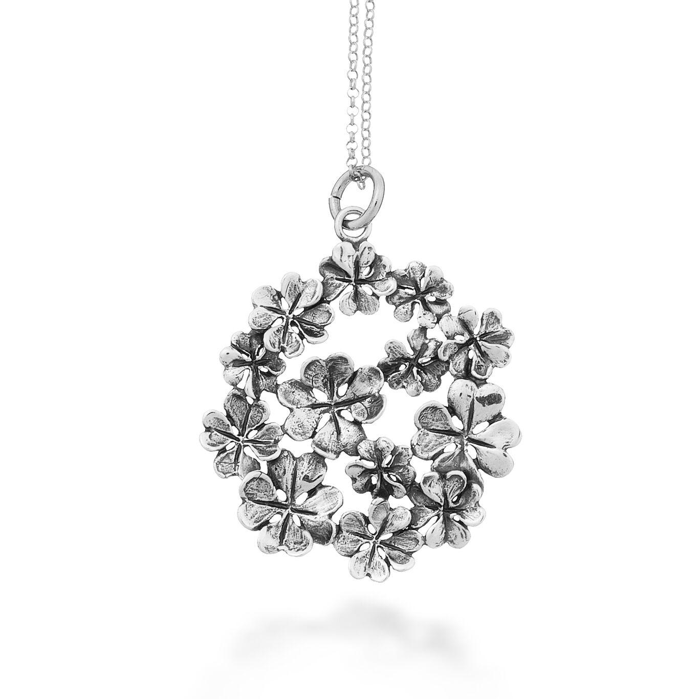 Un piccolo capolavoro in argento brunito, fatto completamente a mano in azienda, appeso ad una delicata catena sempre d'argento. Bellezza e tanta fortuna col pendente Quadrifogli di Giovanni Raspini. Elegante amuleto che racconta mille storie di donne, da portare sempre con sé.