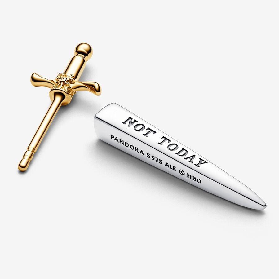 Dimostra la tua fedeltà alla Casa Stark con questo Mono Orecchino Ago della collezione Game of Thrones x Pandora. Ispirato all'iconica spada che Arya Stark riceve da Jon Snow, questo orecchino è realizzato in Argento Sterling 925 ed è caratterizzato da un’elsa nell'esclusiva lega metallica placcata oro 14k con motivi decorativi. L'orecchino è inclinato ed è stato ideato per essere indossato con l'elsa rivolta in avanti. Completato dall’incisione "NOT TODAY" (NON OGGI), è il gioiello perfetto da aggiungere alla tua collezione o da regalare a una fan di Game of Thrones.