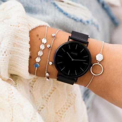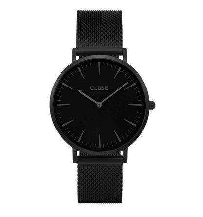 Il nero su nero colpisce. Minimalista. Opaco. Stile singolare sottile ma forte. Completo di sacchetto in similpelle grigia. Come con tutti gli altri orologi della linea La Bohème, puoi facilmente personalizzare questo orologio con qualsiasi cinturino in pelle o a maglie La Bohème o La Roche.