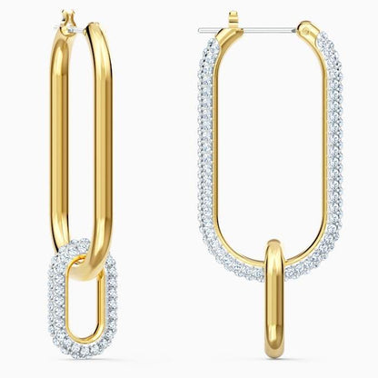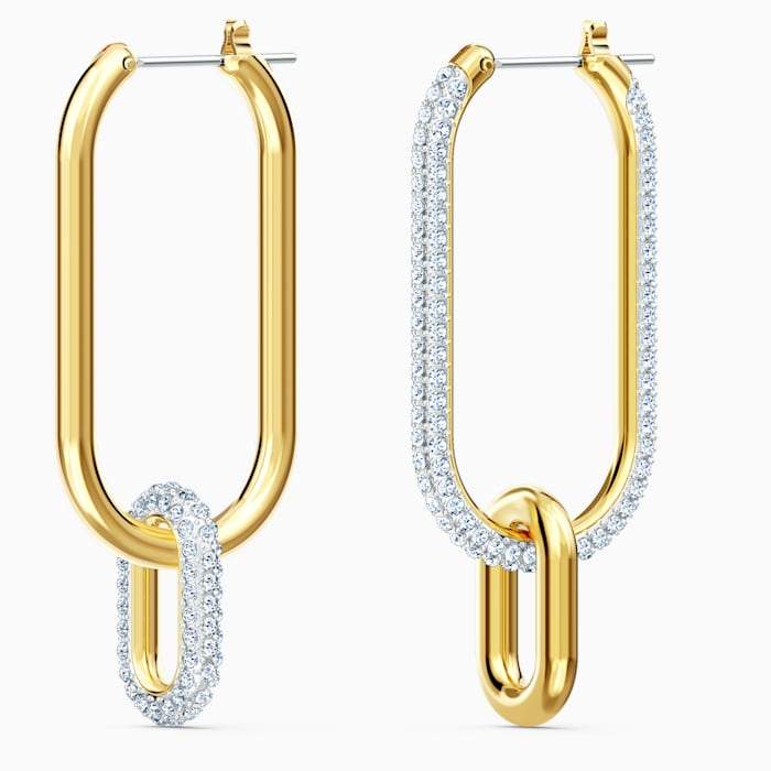 Questo paio di orecchini a buco Swarovski è caratterizzato da silhouette che traggono ispirazione dal trend industriale. Entrambi gli orecchini sono composti da maglie oblunghe della catenina, una delle quali è rivestita in pavé di Clear Crystal che brilla luminoso nella sua disposizione asimmetrica. Le maglie pendenti della catenina possono essere rimosse per diverse possibilità di indossare i gioielli, creando vari look che impreziosiscono in modo splendido i tuoi stili da tutti i giorni.