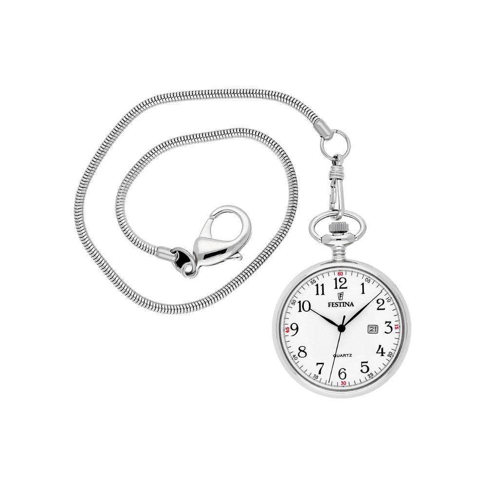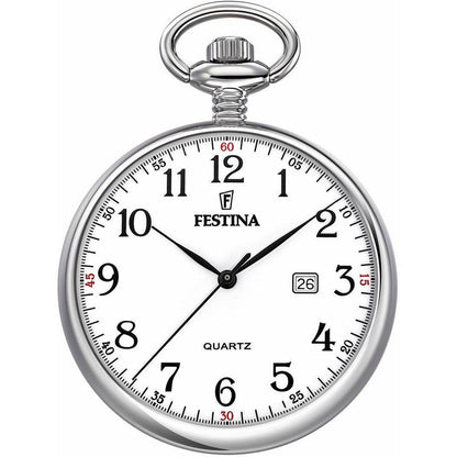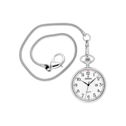 Orologio da taschino solo tempo da uomo della collezione BOLSILLO, con cassa in acciaio del diametro di 49 Mm. Quadrante bianco con numeri arabi e datario, catena lunga cm 35. Movimento al quarzo.