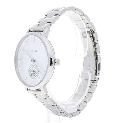 Orologio Solo Tempo Da Donna Di Fossil Della Collezione Jacqueline. Modello Con Cassa Rotonda In Acciaio Inossidabile Di Colore Silver Con Finitura Lucida. Cassa Di Misura 36 Mm E Spessore Di 9 Mm. Ghiera In Acciaio Inossidabile Di Colore Silver Con Finitura Lucida. Il Quadrante È Di Colore Silver Con Vetro Trasparente. Bracciale In Acciaio Inossidabile Di Colore Silver Con Finitura Mista E Chiusura Deployante. La Distanza Delle Anse È Di 14 Mm. Modello Impreziosito Da Cristalli Sul Quadrante. La Resistenza All'Acqua È Di 3 Atm. Orologio Con Movimento Al Quarzo E 3 Sfere. La Referenza È Es4437