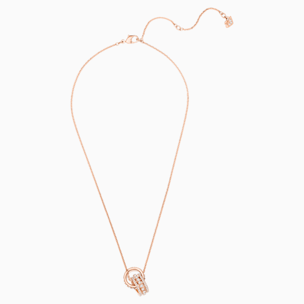 Aggiungi un brillante gioiello alla tua collezione con questo intramontabile pendente placcato oro rosa. Gli anelli intrecciati presentano Clear Crystal che splendono racchiusi in due diverse incastonature, cupchain e pavé, per un’elegante e romantica rivisitazione del classico scintillio Swarovski. Una creazione versatile e raffinata, che donerà un opulento tocco finale a ogni look. Il pendente è abbinato a una delicata catenina.