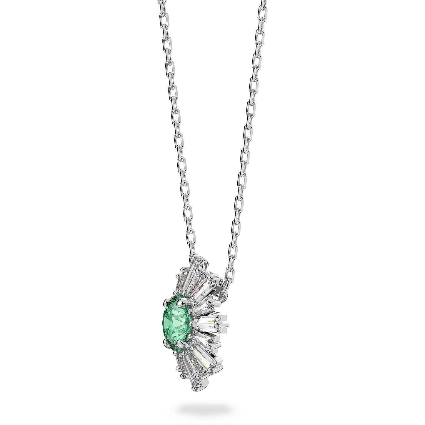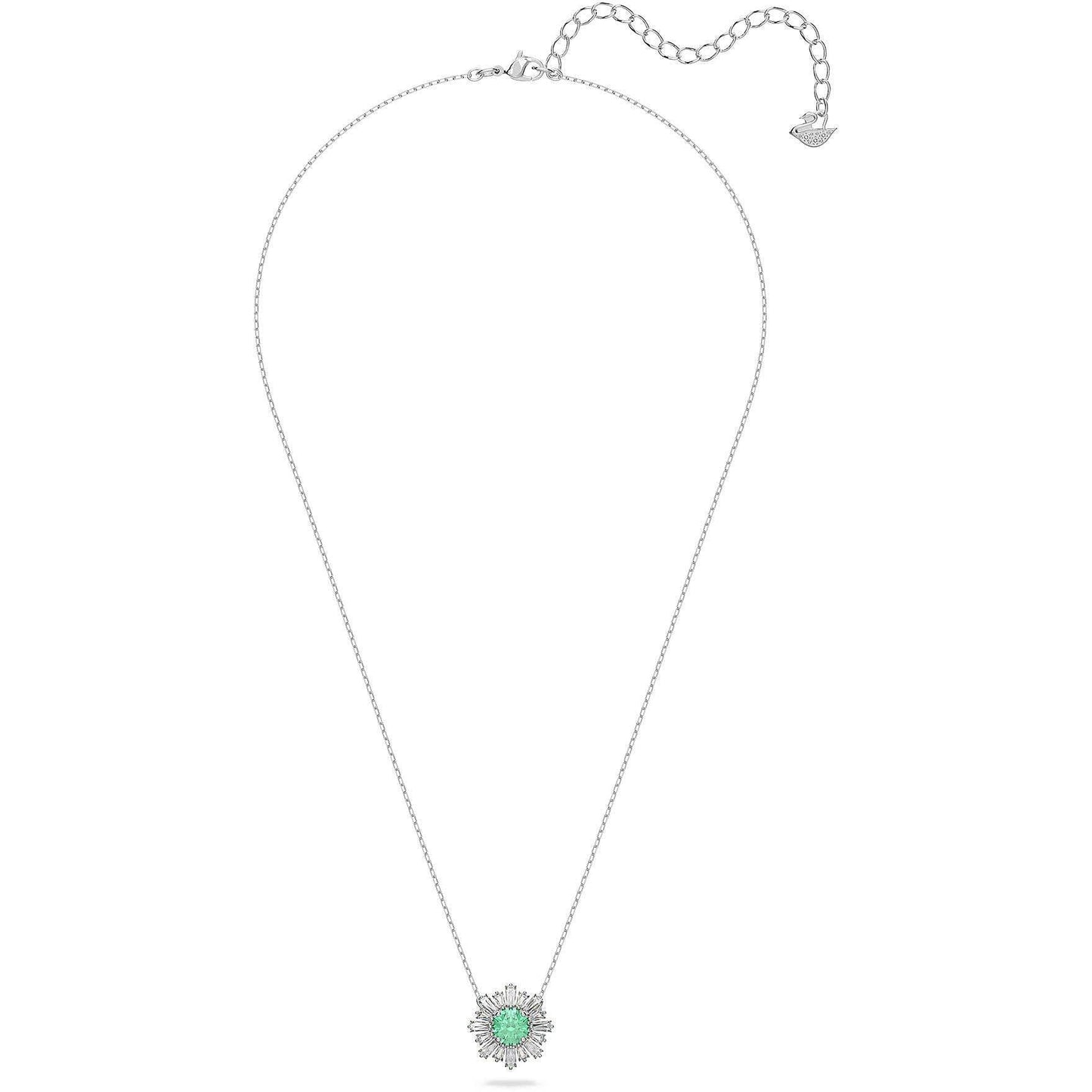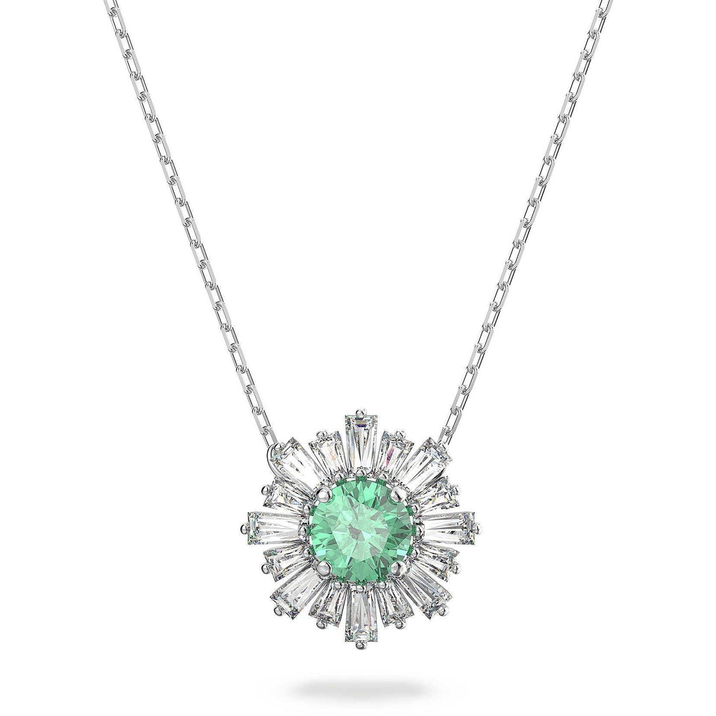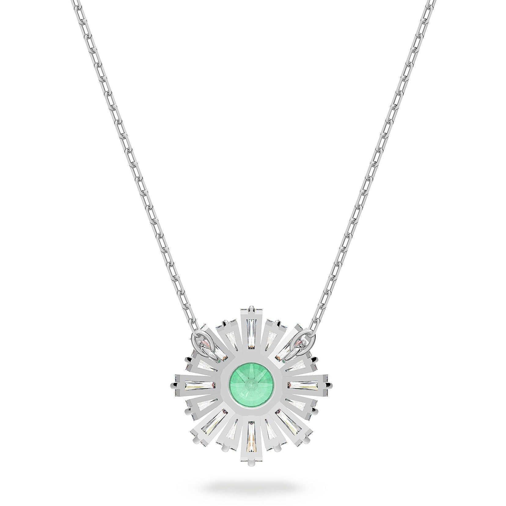 Questo elegante pendente ispirato al sole irradia calore ed energia. Presenta una pietra centrale in un verde vivace incorniciata da raggi di pietre trasparenti ed è rifinito con una montatura placcata rodio. Indossalo da solo o abbinato ad altri gioielli della famiglia Sunshine e i complimenti non tarderanno ad arrivare.