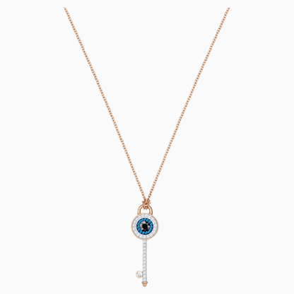 Una silhouette a forma di chiave conferisce un tocco moderno al classico pendente con Occhio di Allah. Realizzato lussuosamente in metallo placcato oro rosa, brilla con un pavé di Clear Crystal e cristalli blu e una “pupilla” nera come elemento centrale. Elegante e romantico, si abbina bene agli orecchini e all’anello coordinati per un autentico stile bohémien.