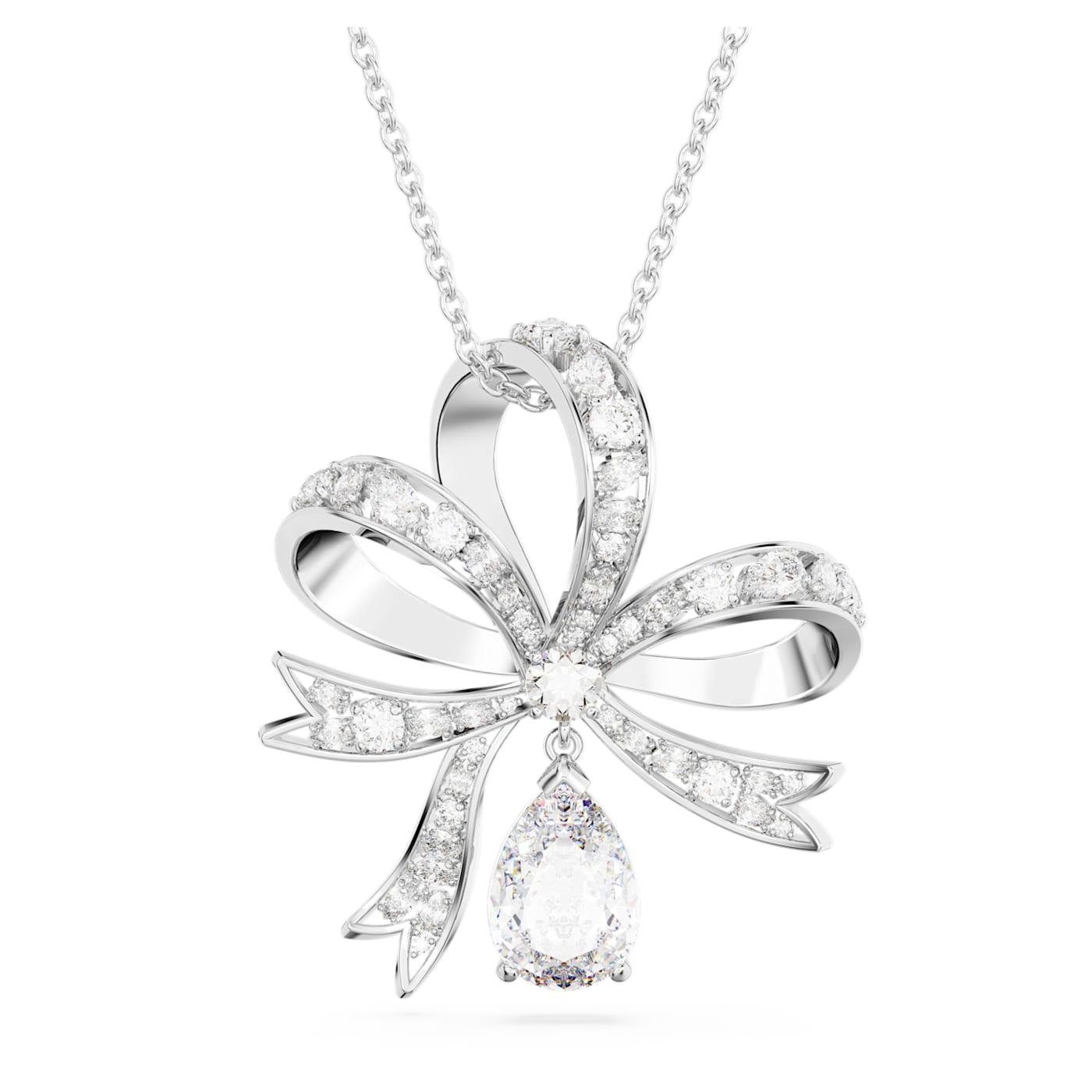Questo pendente Volta è un gioiello di grande stile ispirato al fiocco ed evoca immagini di romanticismo, eleganza e grazia. La forma a nastro è placcata rodio, con una serie di brillanti cristalli trasparenti incastonati utilizzando la tecnica dello chattonage. Due grandi pietre aggiungono fascino, con una decorazione a forma di pera sospesa sotto una pietra rotonda al centro del fiocco. Impacchettato già come fosse un regalo, questo è il gioiello perfetto da regalare a una persona cara per un’occasione speciale.