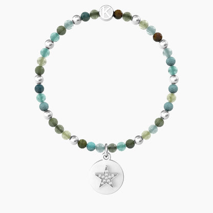 Bracciale elastico in acciaio con agata striata multicolor e ciondolo rotondo con stella di cristalli bianchi e frase "Grazie per esserci sempre amica mia".